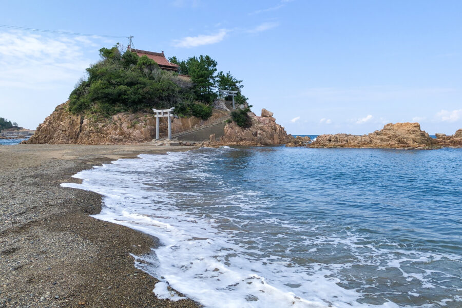 宮ヶ島 衣毘須(えびす)神社は、益田市西部に広がる小浜海岸の岩礁「宮ヶ島」に建つ小さな神社。 満潮時には海の上に浮かぶ小島ですが、干潮の時だけ砂浜の参道が現れ歩いて渡れることから「山陰のモンサンミッシェル」と呼ばれます。 ここは、東山魁夷による皇居壁画「朝明けの潮」のモデルになった場所ともいわれています。 主祭神は事代主之命で、えびす様の総本宮である美保神社からの分霊です。