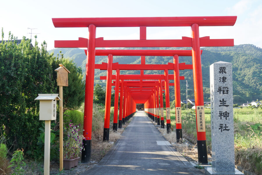 粟津稲生神社(あわづいなりじんじゃ)は、朱塗りの鳥居が並ぶ参道を電車が横切る、とても珍しい神社として話題です。 御祭神は、倉稲魂神(うかのみたまのかみ)、稚彦霊神(わくむすびのかみ)、有気持神(うけもちのかみ)で、治病、厄除けのご利益があるといわれています。 伏見稲荷神社の分社として建立されたと伝わっており、「稲生」という字を当てる神社は全国でも約20か所しかありません。