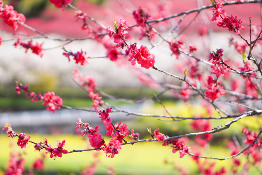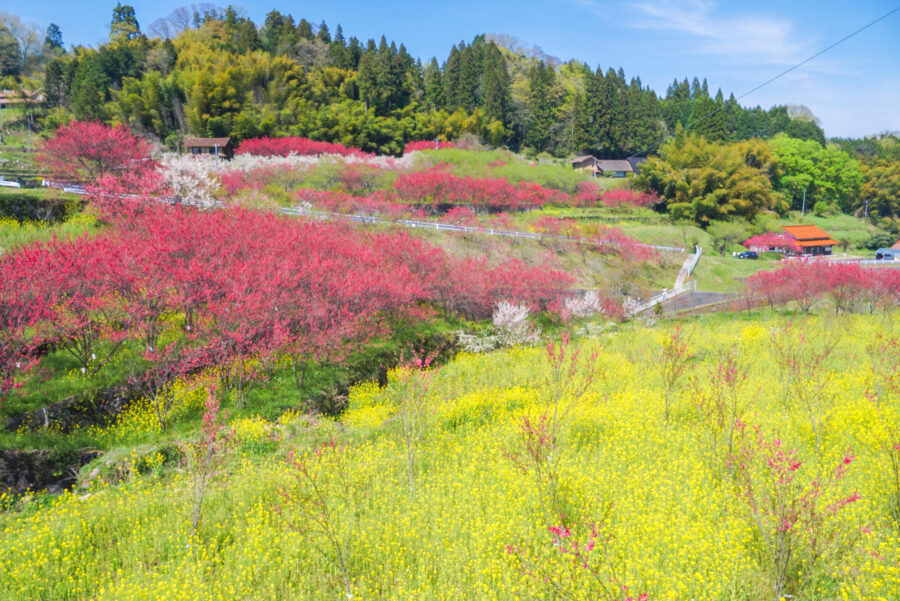 人口わずか13人の川角(かいずみ)集落には、地元の人々の手により2000本以上の花桃の木が植えられています。 春になると一面にピンク、赤、白の花桃が咲き乱れ、黄色い菜の花や草木の緑と相まって美しく、まさに桃源郷のようです。 開花時期は毎年4月上旬頃、4月中旬くらいまでが見頃です。