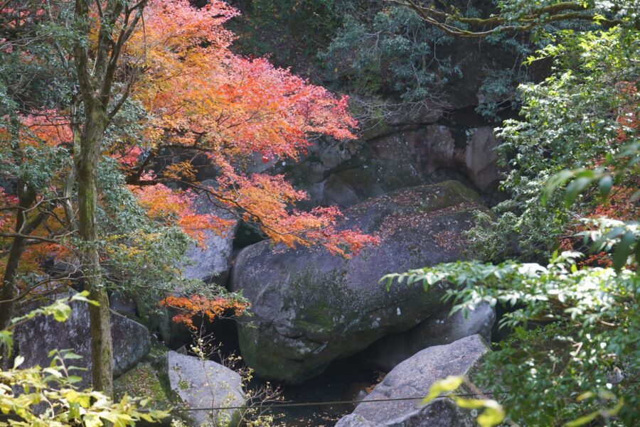 斐伊川の支流大馬木川の約2.3kmにわたる大渓谷。 左右の絶壁と、渓流に転がる奇岩・巨岩が独特の絶景を作り出しています。 高さ45mの深い渓谷にかかった、長さ160mの「舌震の“恋”吊橋」はスリル満点! たくさんの人に楽しんでもらえるようバリアフリーな遊歩道も整備されています。