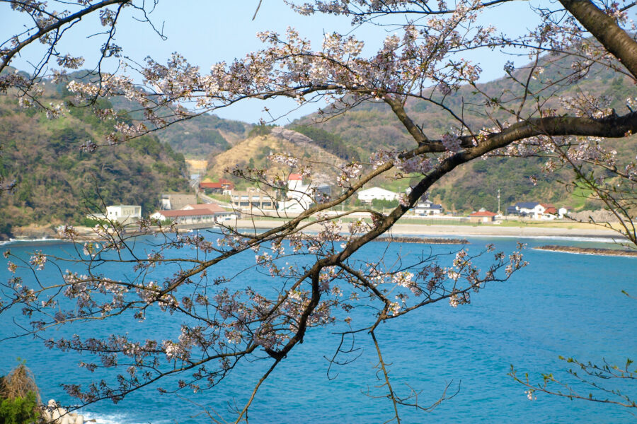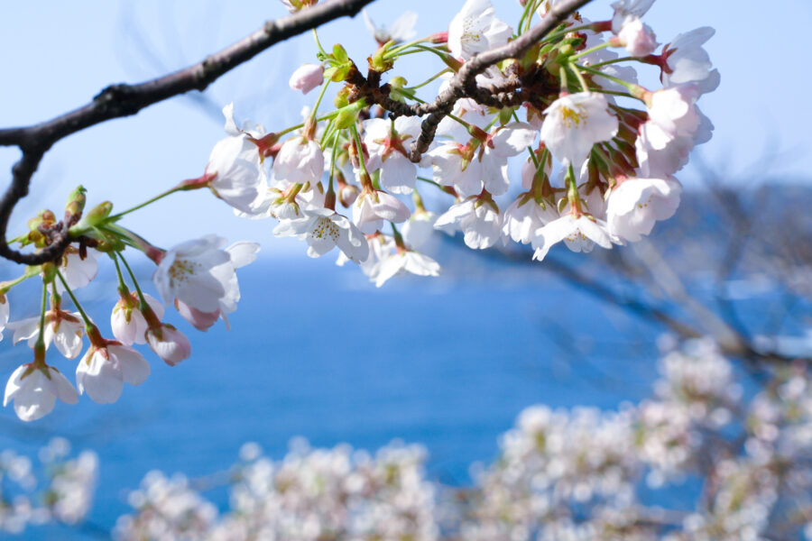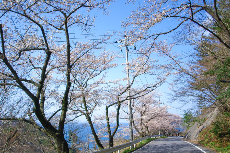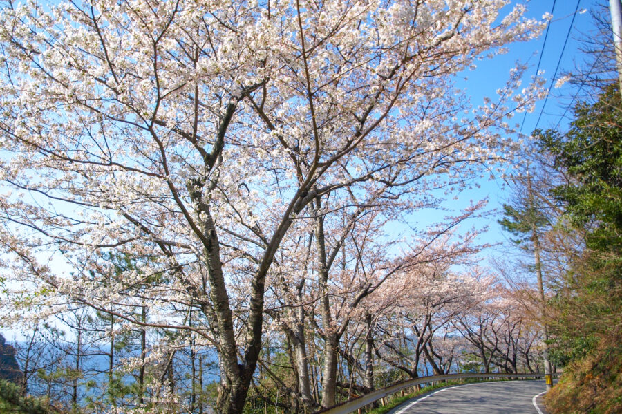 青い海を背景にピンクの桜が映え、松江の人気桜ドライブスポットです。