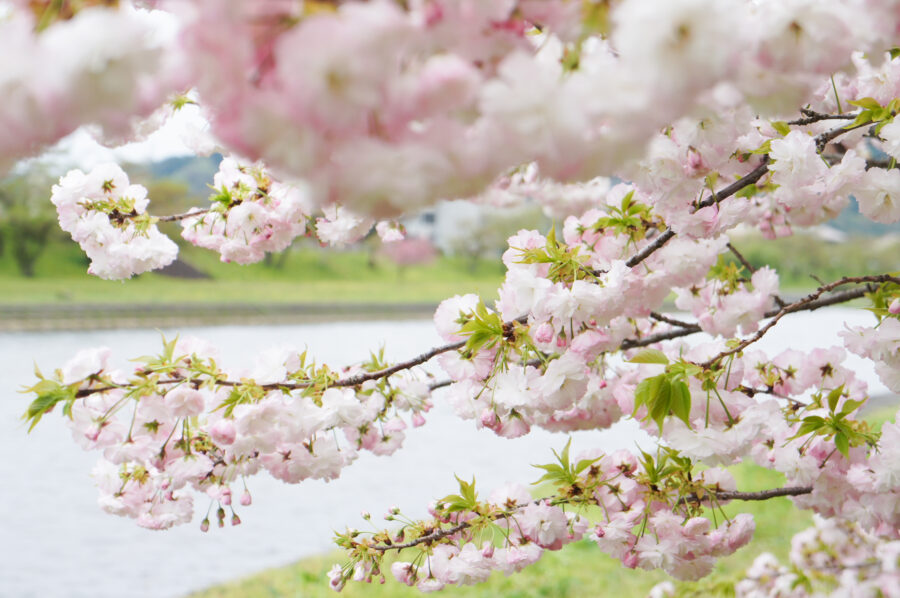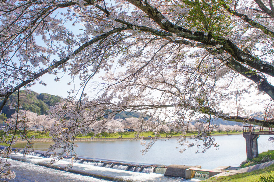 三刀屋城跡のふもとを流れる三刀屋川両岸の土手に、ソメイヨシノ、御衣黄、八重桜など約1000本の桜並木が続きます。
