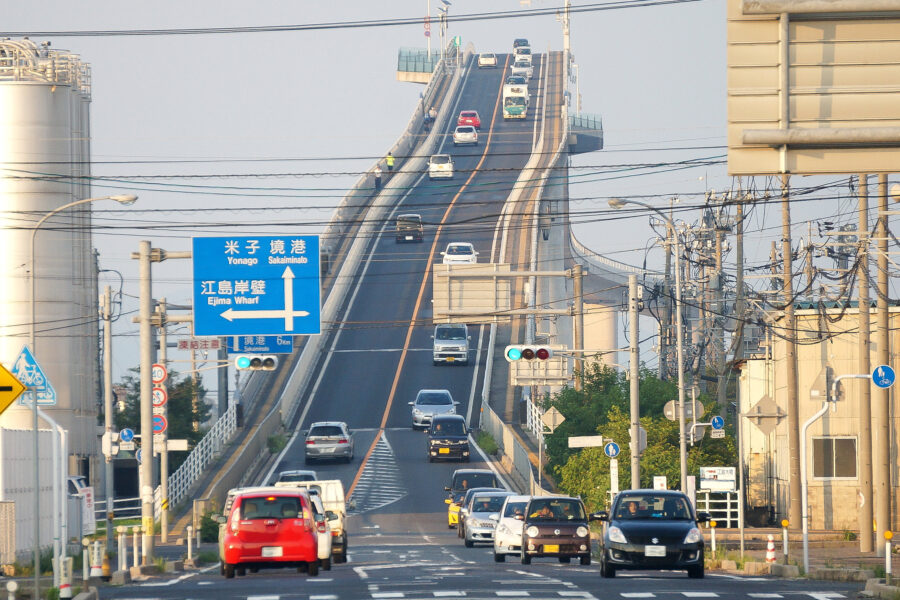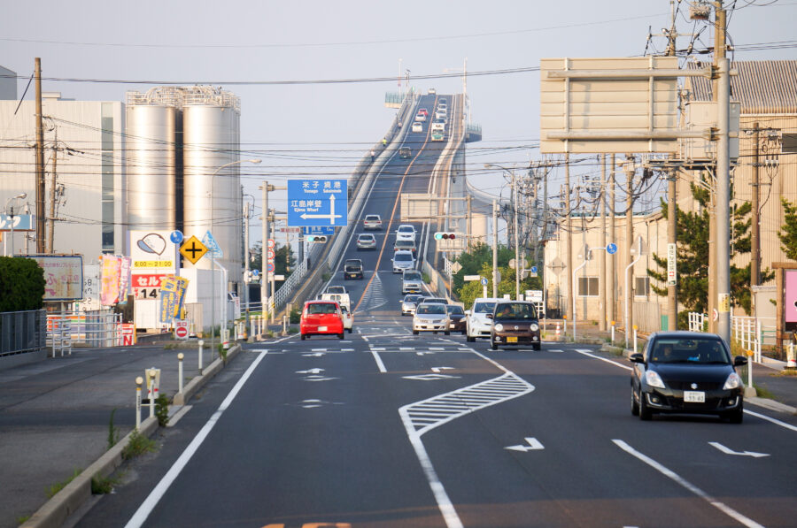 ダイハツのCMで急こう配の橋として登場し、一躍全国的に有名になりました。 島根県松江市と鳥取県境港市とを繋ぐ橋で、島根側の坂は6.1%の急こう配。 正面から望遠で撮影すると、まるで壁がそそり立っているように見えることから「ベタ踏み坂」とも呼ばれますが、実際に走ってみるとベタ踏みしなくても登れます。 サイクリングルートとしても人気で、鳥取側から渡る際に眼前に広がる中海や、橋の頂上からの眺めは絶景です。 また夜ライトアップされた光景も見ごたえがあります。