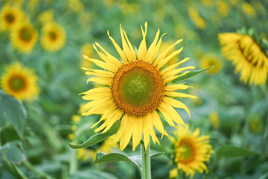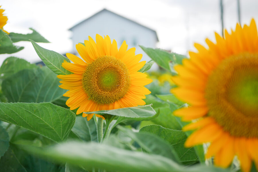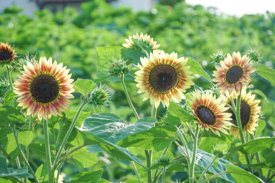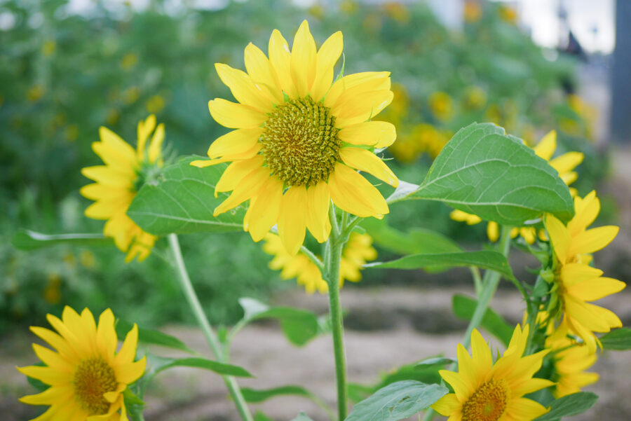 出雲縁結び空港に近い農地に広がるひまわり畑。 農業組合法人おきすの方たちが、空港の玄関口にひまわりを咲かせて観光客に楽しんでもらおうと栽培しています。 色やサイズも異なる様々な種類のひまわりの花があります。