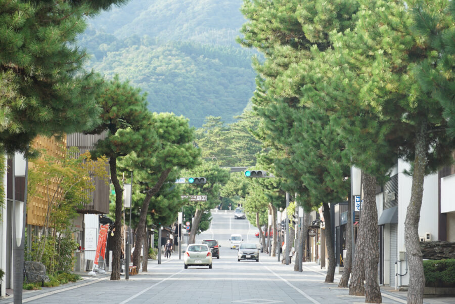 出雲大社の入り口となる一の鳥居から正門まで約700m、出雲大社の表参道がまっすぐ伸びています。 松並木の参道の両側には、お土産屋さんや出雲そば、ぜんざい、パワーストーンの店、カフェ、ご縁横丁など、様々なお店が並ぶ賑やかな通りです。
