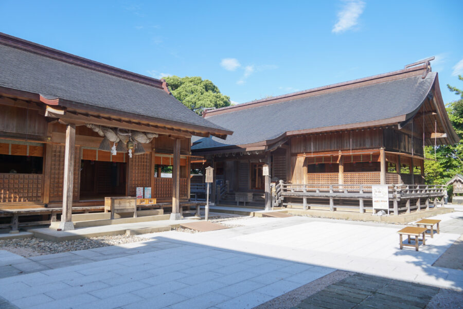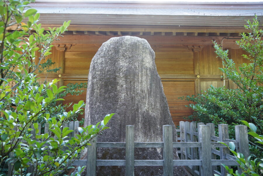 通常の神社と異なって本殿がなく、拝殿背後の磐座を拝する形となっています。