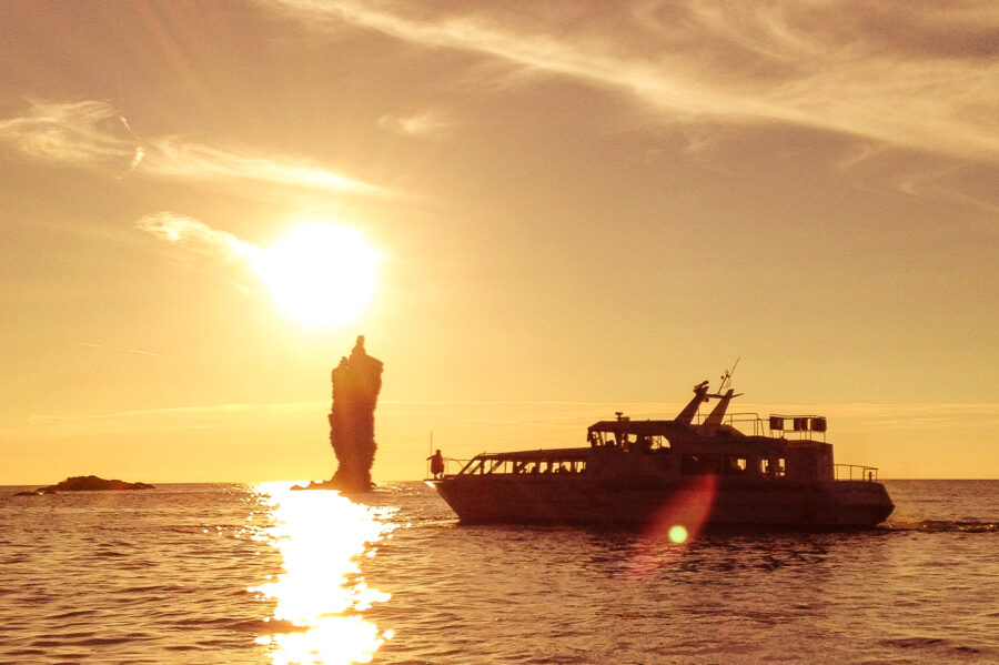 隠岐の島町の沖合に浮かぶ高さ約20mの奇岩で、夕陽が先端に重なると、まるで巨大なロウソクに火を灯したように見えます。