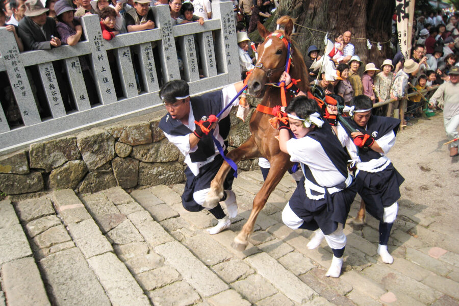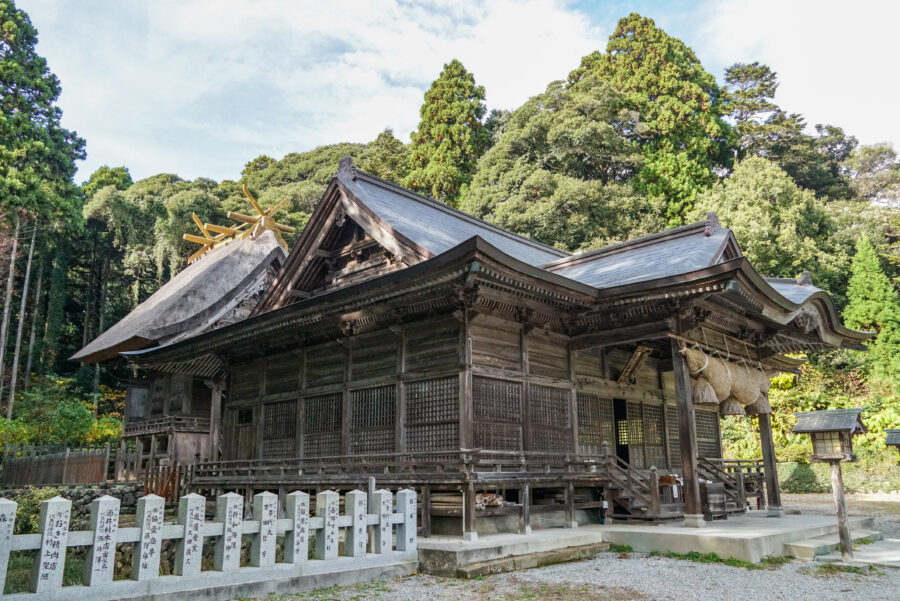 隠岐の島の開拓した玉若酢命(たまわかすのみこと)を祀る隠岐国の総社で、本殿は隠岐の島町最古。 境内の八百(やお)杉は樹齢約2000年と言われて、八百比丘尼が植えたという伝説もあります。 毎年6月5日には、御霊会風流(ごれえふりゅう)という勇壮な馬入れ神事が行われます。