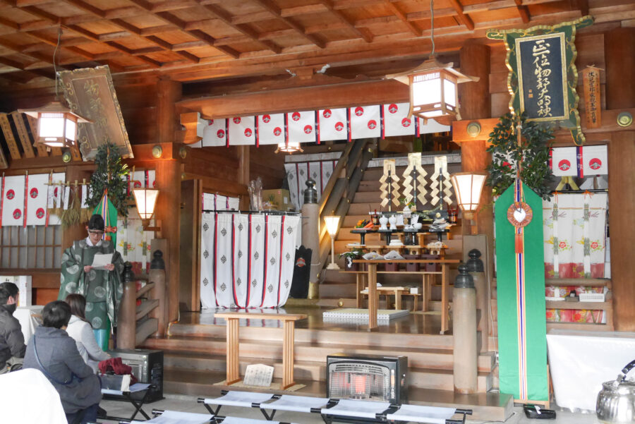 また神武天皇御即位の時、御祭神は五十串(いほくし)を樹て、韴霊剣・十種神宝をもって天皇のために鎮魂宝寿を祈願し、これが鎮魂祭の起源と言われます。