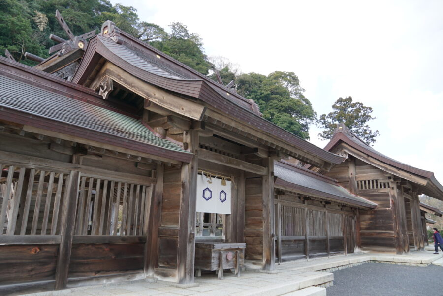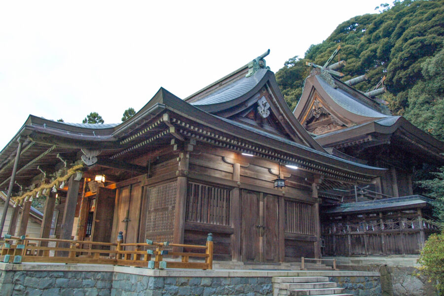 美保湾を望む場所に建ち、大社造りの本殿が二つ並ぶ珍しい形式の社殿に、大国主神の御后神である三穂津姫命(ミホツヒメノミコト)と御子神である事代主神(コトシロヌシノカミ)を祀っています。