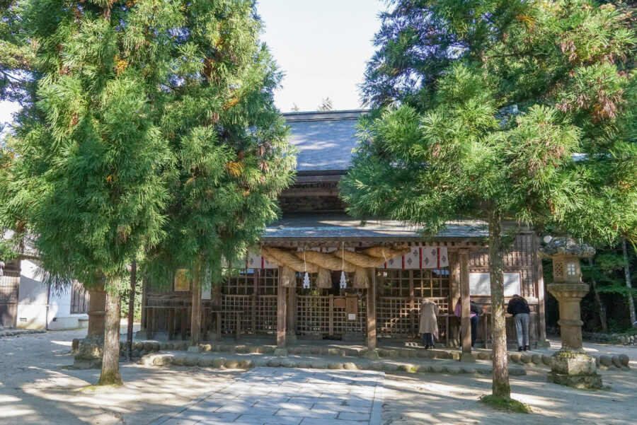本殿後ろに立つ巨大な杉の木にもパワーが宿ると言われ、多くの人が訪れます。