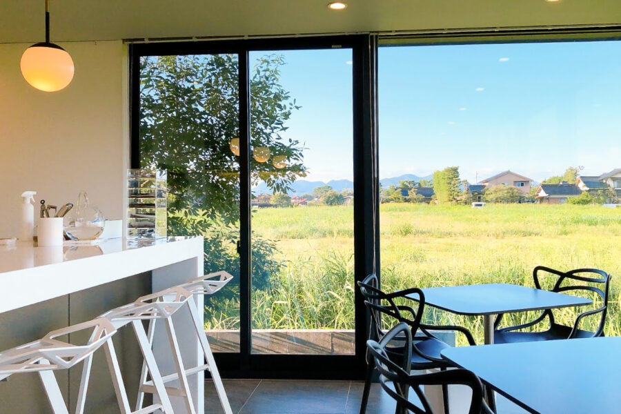 田園風景の中に浮かぶ白くておしゃれな建物。