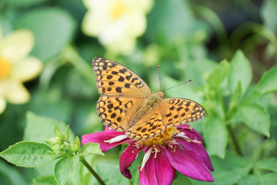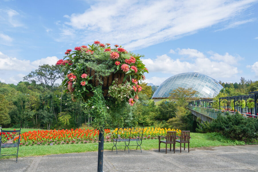 センターに位置するドーム型ガラス温室を中心に、美しい花々が四季を彩ります。