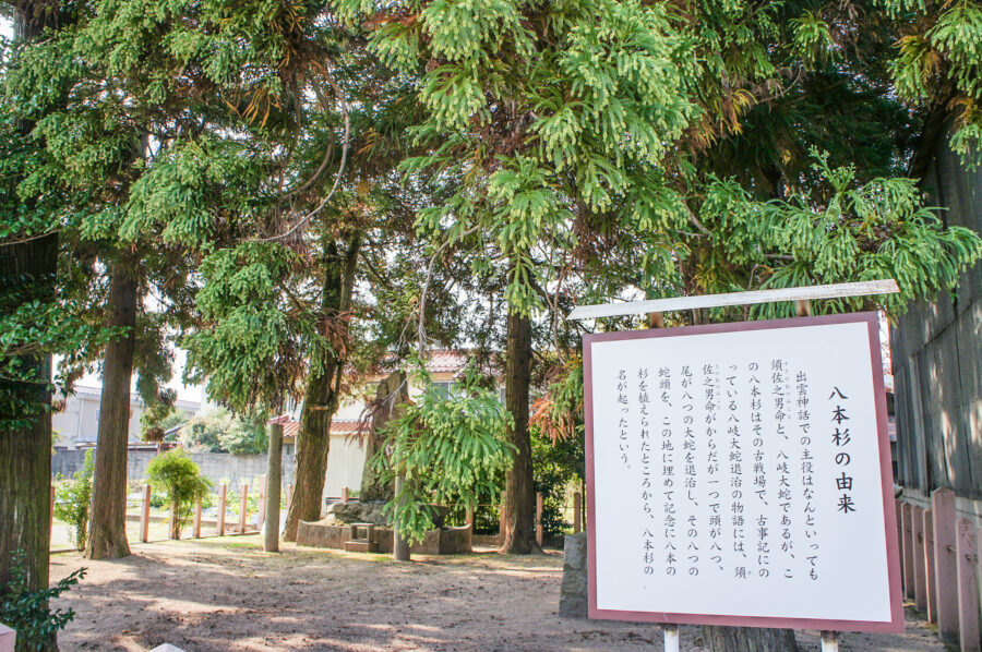 そこは八本の杉が立つ不思議な場所で、地元ではスサノオノミコトがヤマタノオロチを退治した後、八つの頭を埋め、その上に八本の杉を植えたと言われています。