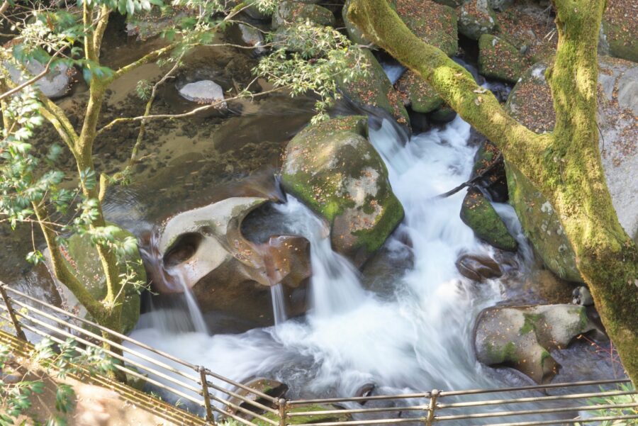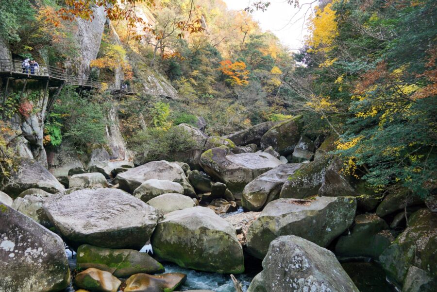 斐伊川の支流大馬木川の渓流に沿って、巨岩・奇岩がごろごろと連なる奥出雲の景勝地・鬼の舌震。絶壁や巨岩を背景とした紅葉は、まさに絶景です。