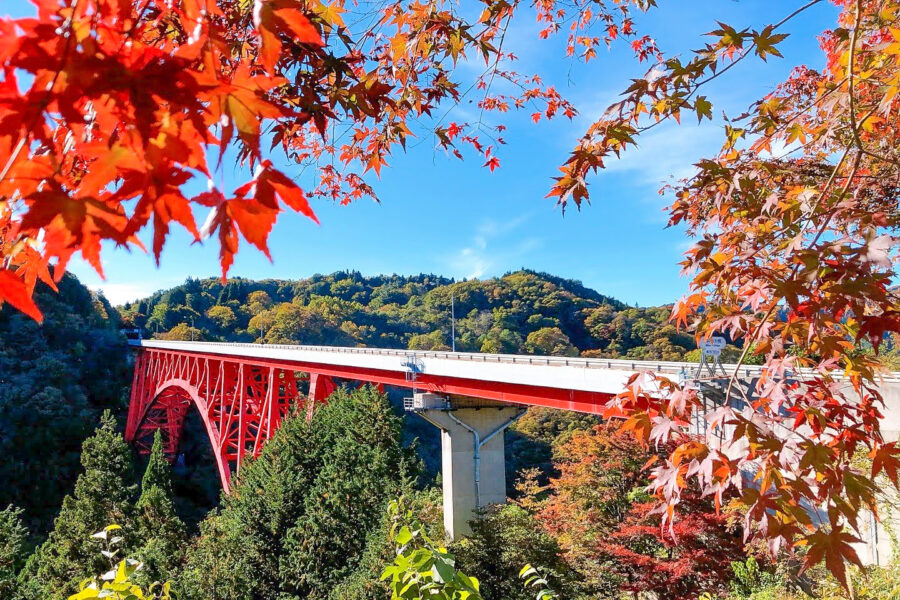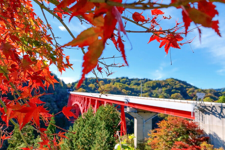 道の駅からながめる三井野大橋の赤いアーチが、特に紅葉スポットとして人気。