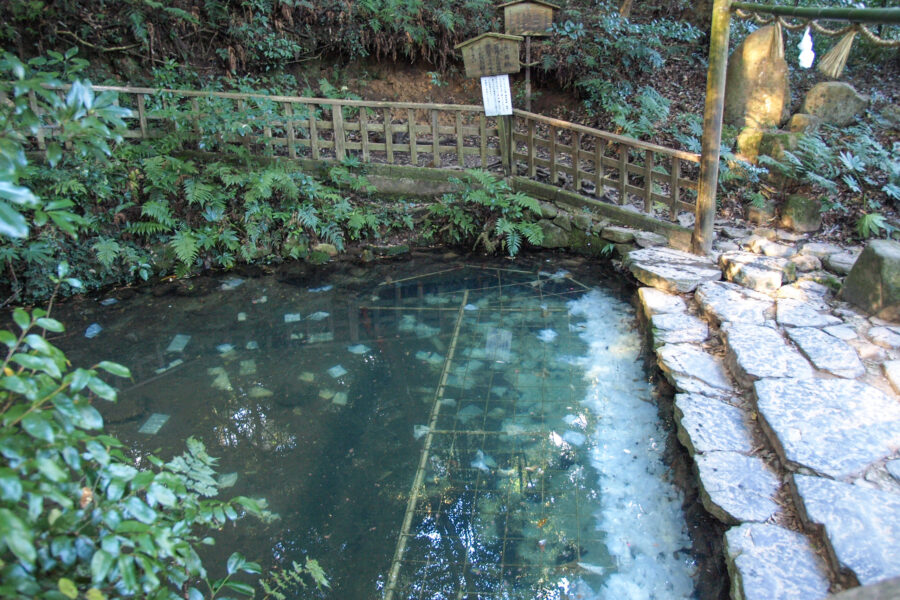 境内奥にある「鏡の池」で、和紙に硬貨を乗せて浮かべ、ご縁を占う「縁占い」が昔から人気で、八雲は著書の中でその様子を大変興味深く紹介しています。