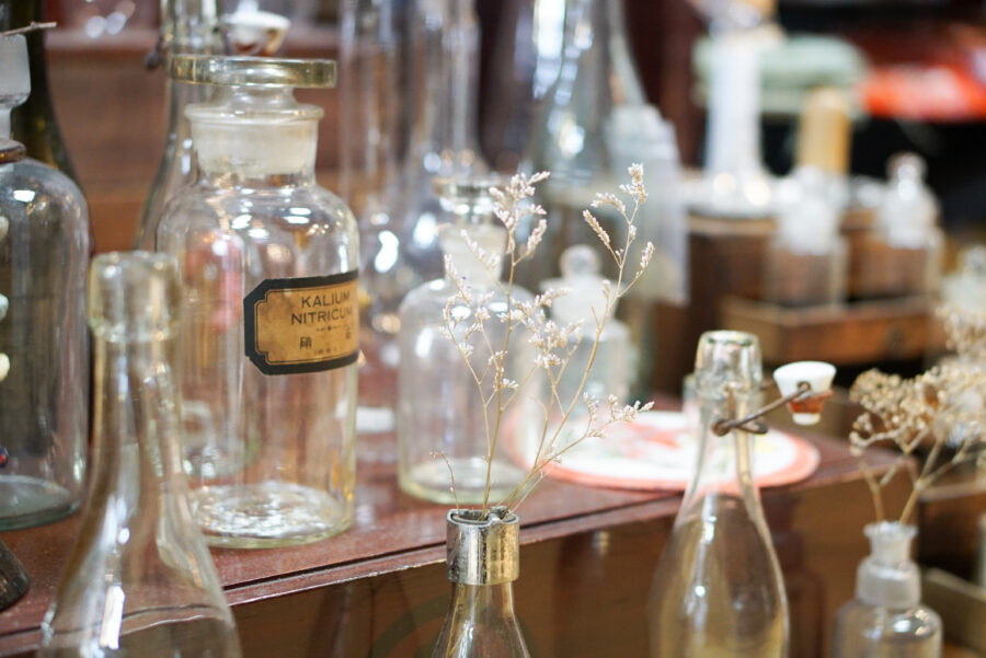 レトロなガラス瓶が並ぶ山口薬局