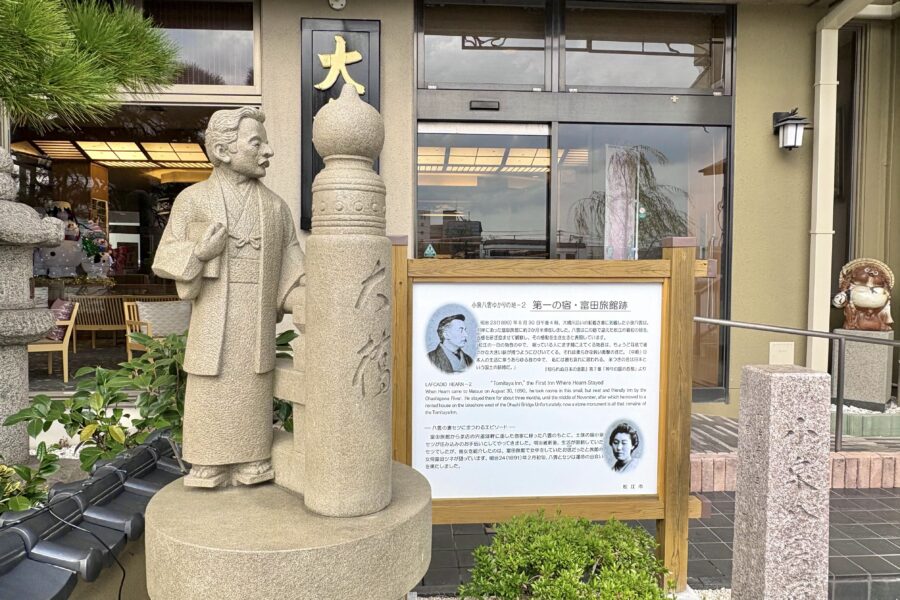 最初の宿・富田旅館跡付近に立つ小泉八雲像
