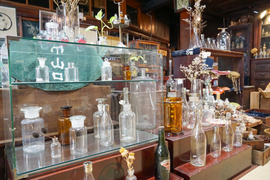 山口卯兵衛商店には、今も立派な薬箪笥があって歴史を感じさせます。また蔵から発見した昔の薬瓶やレトロなガラス容器の数々が並び、見ているだけで楽しくなります。