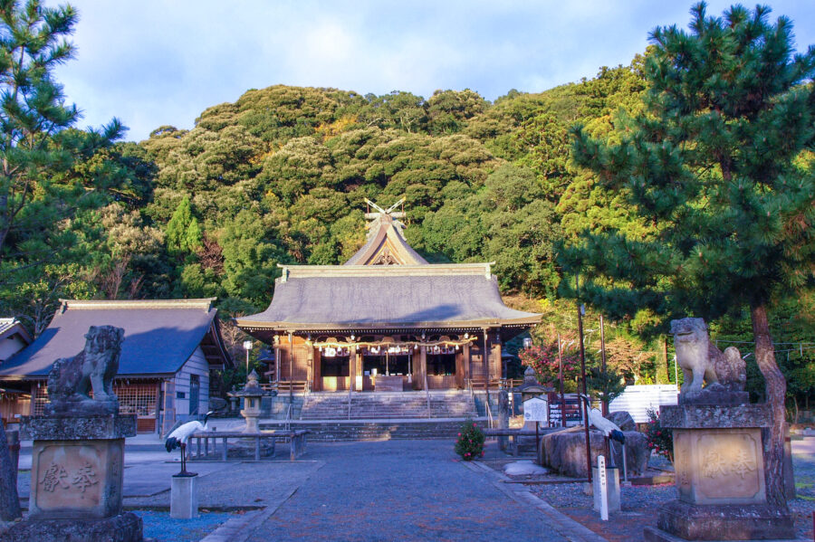正面の天照大神を祀る日沉宮(ひしずみのみや)と、右手の小高い場所にスサノオノミコトを祀る神の宮(かんのみや)があります。